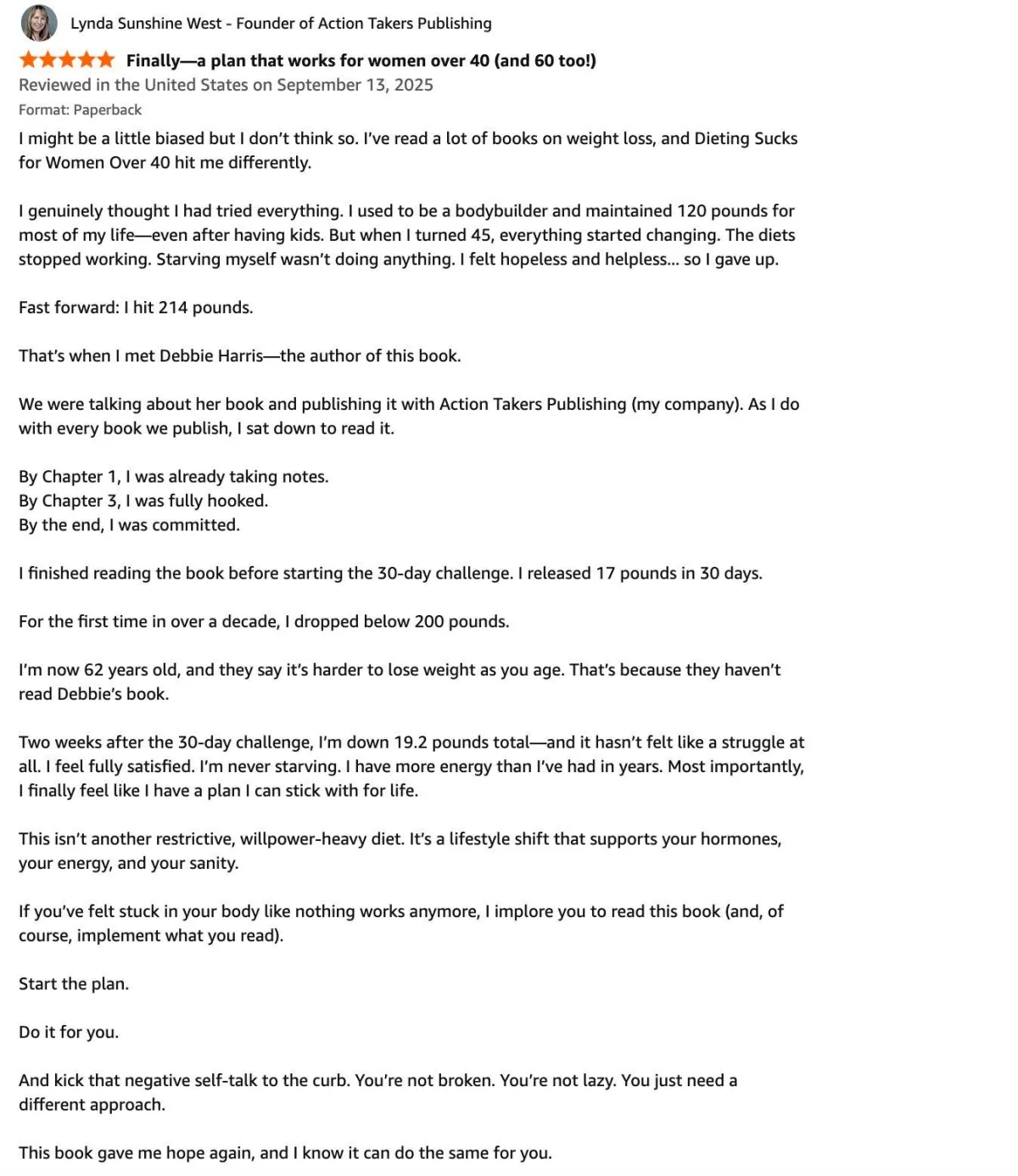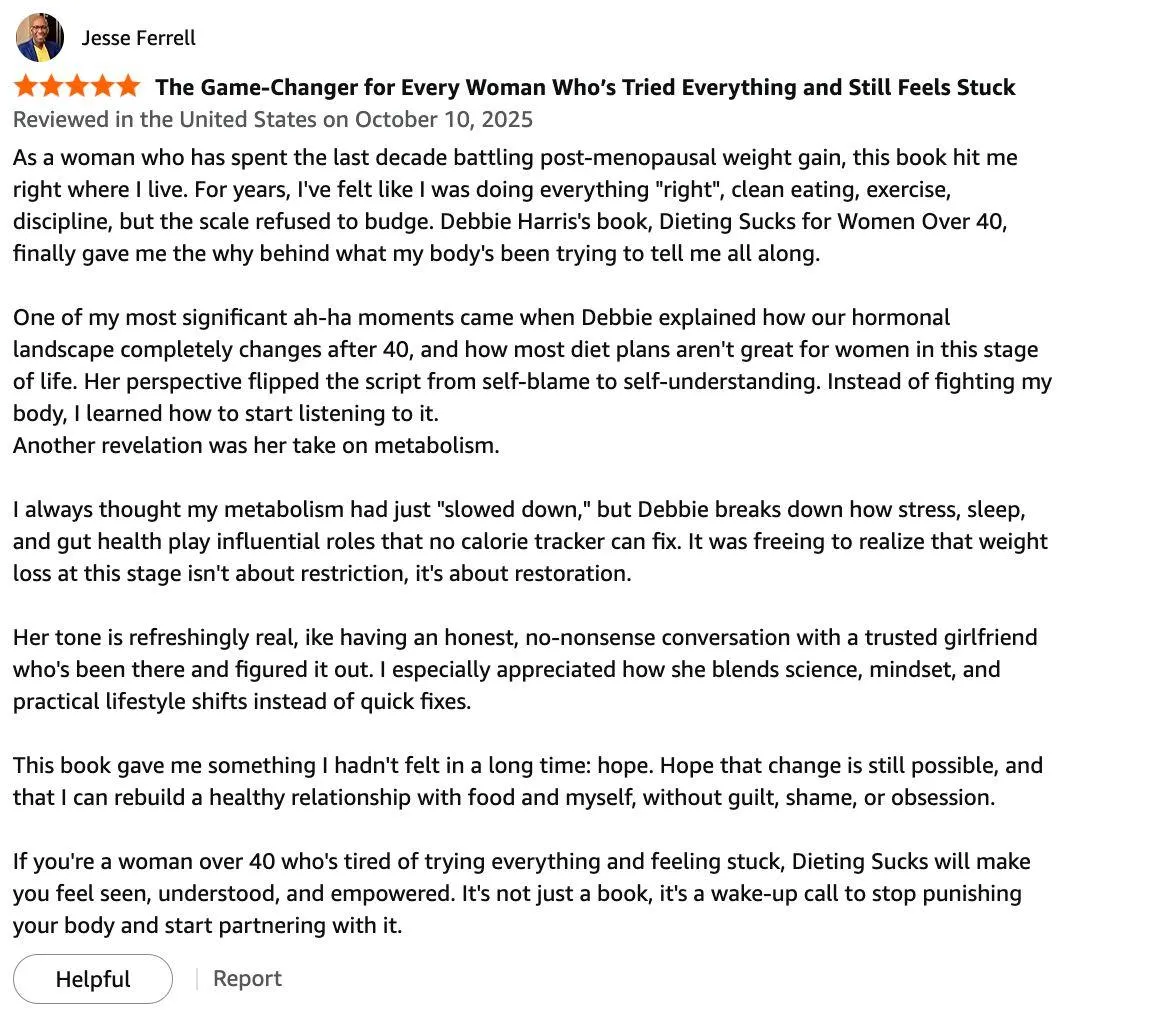 Debbie Harris’s book, Dieting Sucks for Women Over 40, is available through major retailers, independent bookstores, and digital reading platforms around the world. Choose your preferred store below to order your copy today.
